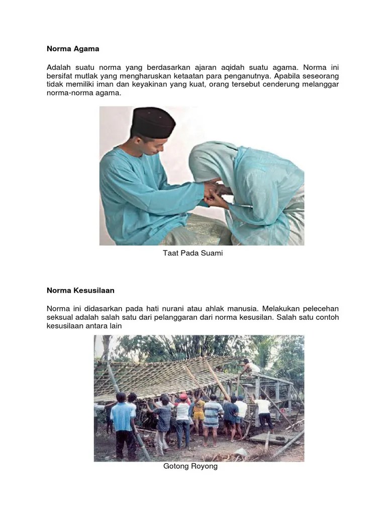 Perubahan teknologi dan pembauran budaya dari berbagai daerah/negara juga bisa menjadi penyebabnya. Norma juga bisa diartikan sebagai ketentuan yang mengatur tingkah laku manusia dalam kehidupan masyarakat. Di sini akan dibahas lebih mendalam mulai dari pengertian, ciri, fungsi, sampai dengan . Norma telah dikenal sebagai aturan . Norma keagamaan adalah peraturan atau kaidah yang sumbernya dari firman atau perintah tuhan melalui nabi /utusannya.